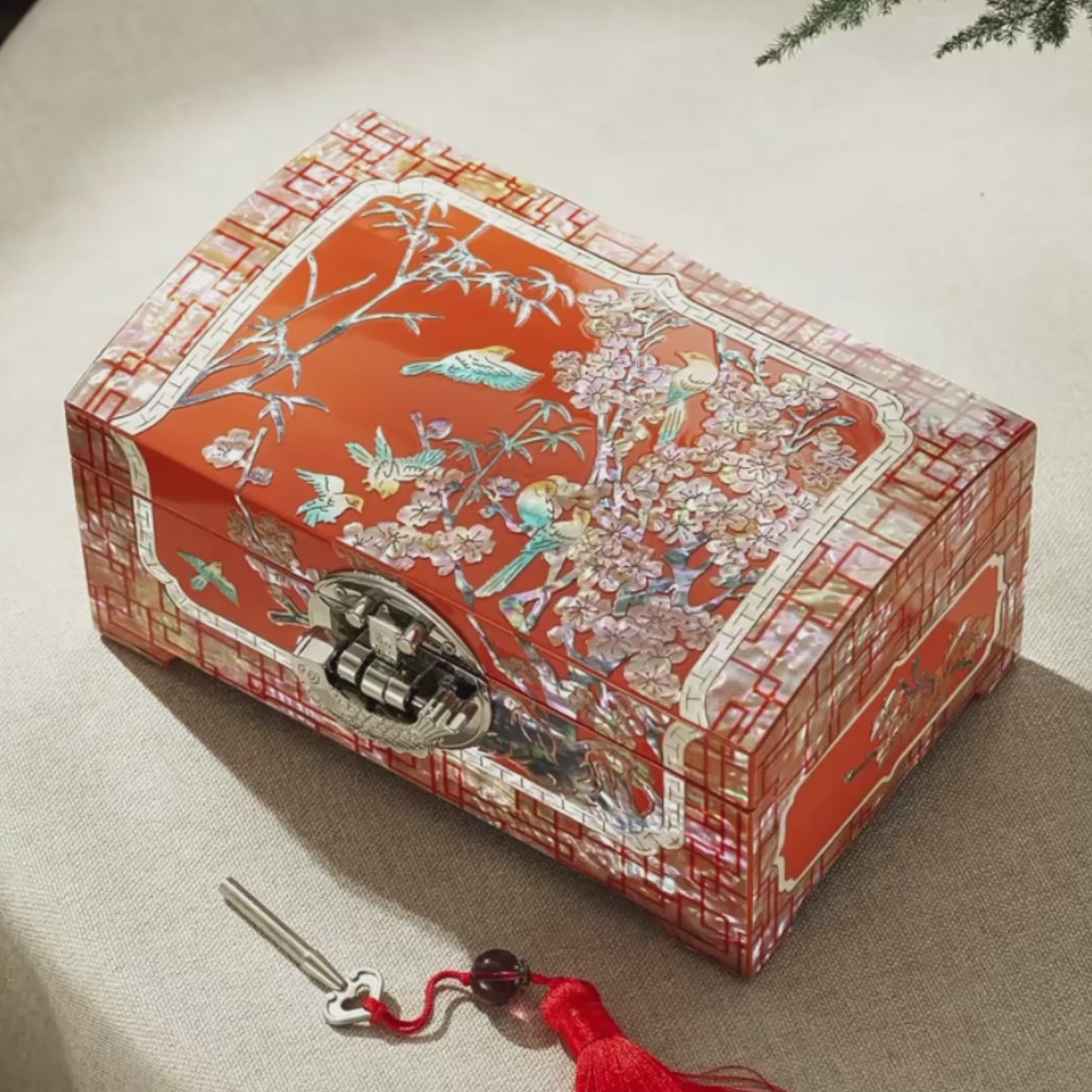 This Chinese Mother-of-Pearl Jewelry Box blends rich red lacquer with age-old inlay art: plum blossoms (prosperity), bamboo (resilience), and birds (joy)—classic symbols of good fortune in Chinese culture.A luxurious piece of Eastern heritage, it’s more than storage: it’s a meaningful gift for anyone who loves Chinese elegance—timeless, radiant, and full of warm wishes.